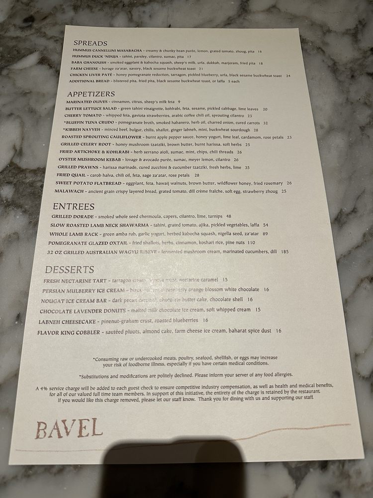Introducing Bavel, a Middle Eastern restaurant located in Los Angeles, California. With a plethora of options catering to various dietary preferences like Pescatarian, Vegan, and Vegetarian, Bavel ensures a diverse dining experience. The ambiance is trendy, upscale, and perfect for group gatherings or special occasions. Despite the loud setting, the attentive staff adds a personal touch, enhancing the overall dining experience. Customers rave about the duck hummus, wagyu beef cheeks tagine, and labneh cheesecake, highlighting the exceptional flavors and presentation of the dishes. The menu encourages sharing and exploring different flavors, making it an ideal spot for food enthusiasts. Don't miss out on the fluffy pita, grilled prawns with tzatziki, and the baba ghanoush. Bavel promises a memorable culinary journey with its unique and flavorful Middle Eastern cuisine.